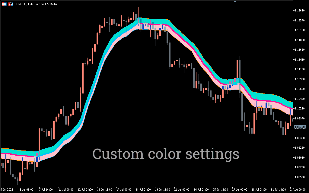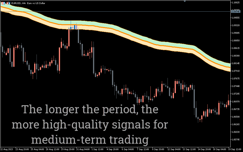 The indicator displays the channel with a green or orange upper, lower and middle line. The upper and lower lines of the channel act as support or resistance lines in relation to the price. However, the middle line acts as a trend line. The trading strategy is to buy or sell as soon as the price breaks above or below the zone.