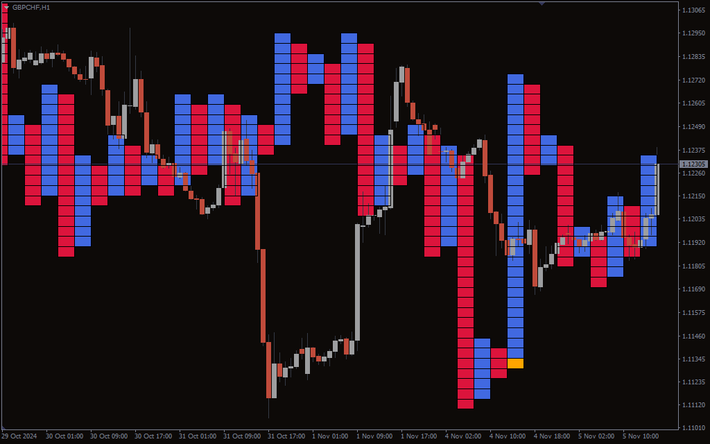The XO Indicator generates simple, easy-to-read signals based on the price direction. The indicator displays blocks in different colors to represent upward and downward price movements. The color scheme allows traders to quickly identify changes in trend direction. An uptrend is indicated by blue blocks, while a downtrend is shown with red blocks. This visual distinction makes it easier for traders to monitor the ongoing trend and spot potential reversals.
