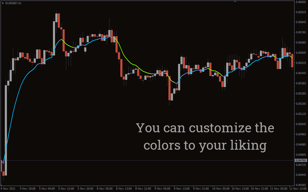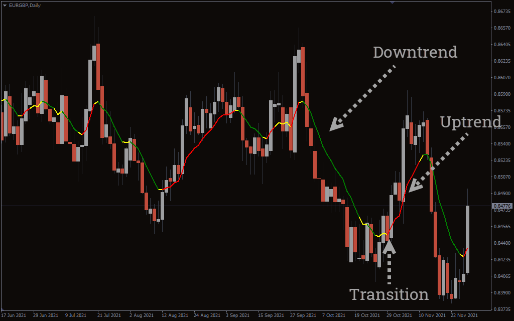 The chart above shows price movement for the euro against the Great Britain pound. During a downtrend, the price moves below the indicator, which is green in color? Similarly, the indicator changes color to red during an uptrend, and the price moves above the indicator line. It is pretty much easy to use the indicator.