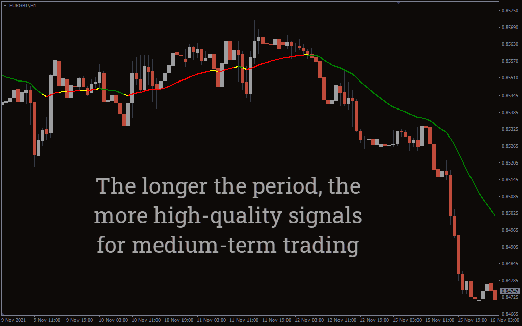 The XPMA indicator forms a moving average line that follows the price pattern. The line changes color to green, yellow, or red depending on the existing trend.