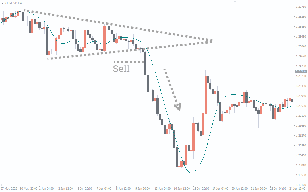 We initially spotted a symmetrical triangle pattern in the above GBP/USD 4-hour chart. Once the price moves below the indicator level, it also breaks the triangle’s support line, plotting an ideal opportunity to go short following the bearish breakout.