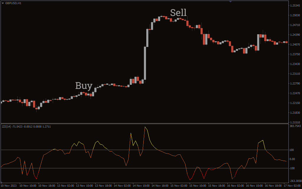 When the signal line crosses the 100 threshold level from the bottom up, the Zee Zee I indicator will create a buy signal. The indicator will create a sell signal when the indicator’s signal line crosses the -100 level.